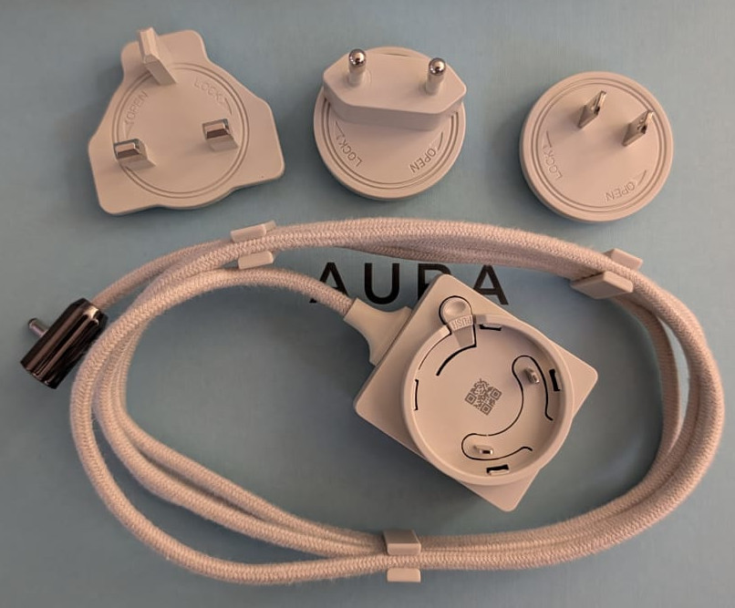 En la caja encontraremos el marco digital Aura Canver, cable de luz y 3 enchufes eléctricos por si también te lo quieres llevar de viaje y no debas comprar un conector universal, manuales y garantía.
