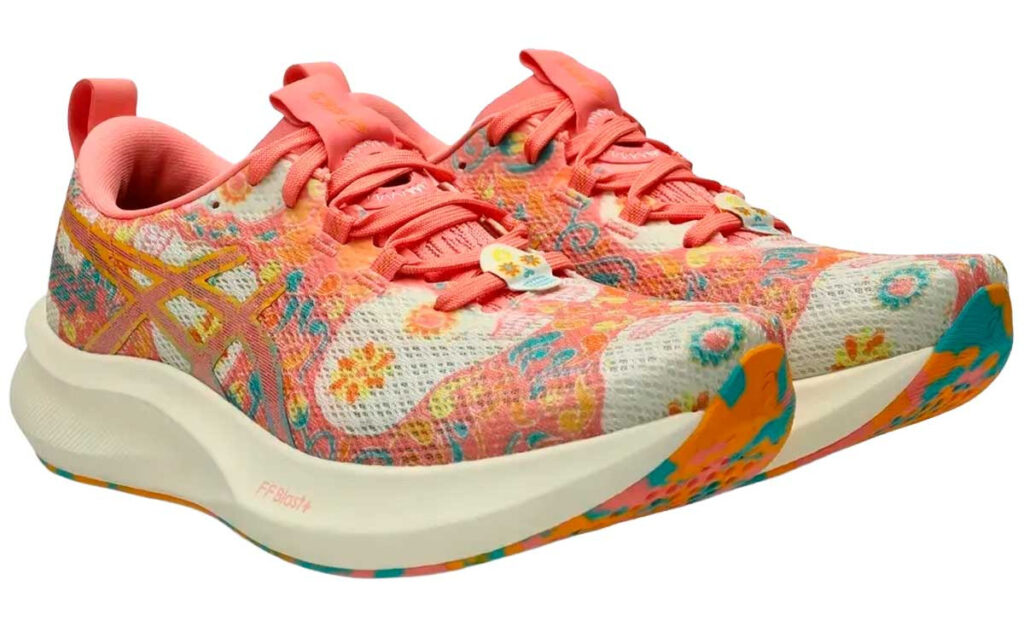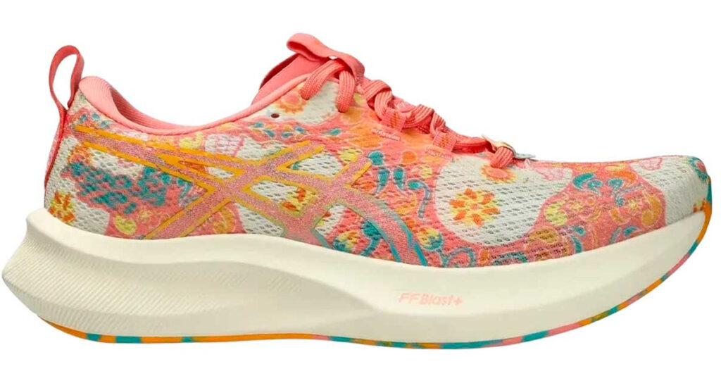 El Noosa Tri 16 edición especial mantiene los diseños coloridos y atrevidos que los caracteriza, a menudo inspirados en obras de arte o temáticas visuales llamativas como en esta ocasión que está diseñada con la temática de día de muertos con gráficos como cráneos, calaveras, flores de cempasúchil en colores azul y guayaba (rosa). La parte superior es de malla técnica transpirable de diseño abierto (engineered mesh / lightweight mesh), lo cual es excelente para mantener el pie fresco, especialmente en climas cálidos. Cuenta con detalles de diseño pensados para triatlón, como tiradores en talón y lengüeta para “ponerse rápido”