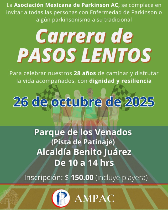 Con motivo de su 28º aniversario, la Asociación Mexicana de Parkinson, A.C. realizará el próximo domingo 26 de octubre a las 10:00 a.m. en el Parque de los Venados, CDMX, la tradicional “Carrera de los Pasos Lentos”, un evento único que busca sensibilizar a la sociedad sobre la enfermedad de Parkinson y rendir homenaje a la fortaleza de quienes la enfrentan día a día.