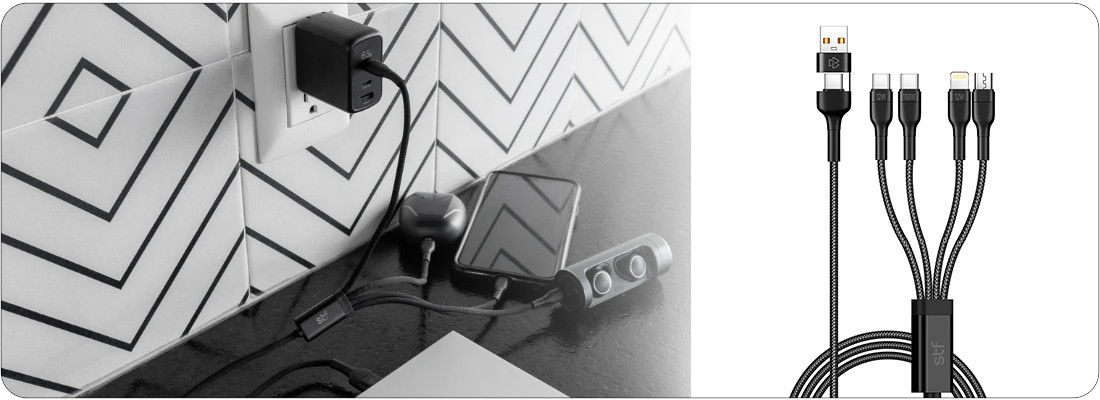 l aliado perfecto para quienes viajan ligeros y conectan más de un dispositivo. Su diseño multifuncional combina USB, Tipo-C, Micro USB y Lightning, permitiendo cargar y sincronizar todo tipo de equipos con un solo cable. Gracias a su potencia de 100W y compatibilidad con cargadores GaN, ofrece una carga ultra rápida y segura en cualquier parte del mundo. Su estructura trenzada reforzada y carcasa de aluminio garantizan resistencia y durabilidad incluso en los trayectos más exigentes.