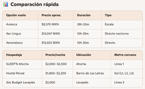 Prompt sugerido: “Busca vuelos en julio para viajar a Madrid; prefiero viajar de noche y saldré de Ciudad de México. Dame precios aproximados y las mejores recomendaciones, además, dame las mejores sugerencias económicas de hospedaje y de preferencia que estén cerca de algún metro”.