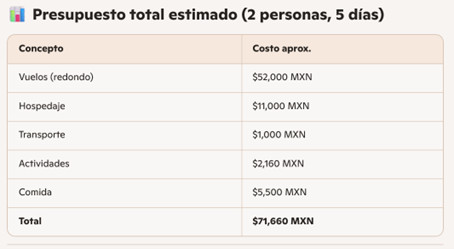 Prompt sugerido: “Arma un presupuesto total estimado de dos personas tomando en cuenta el avión, hospedaje, transportación, costo de las actividades sugeridas como museos y el aproximado de gastos de comida”.